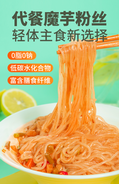 美味大膽嗦,解饞無(wú)腹擔(dān)。魔芋粉絲晶瑩透亮,含有葡甘聚糖,具有強(qiáng)大的膨脹力,產(chǎn)生飽腹感。